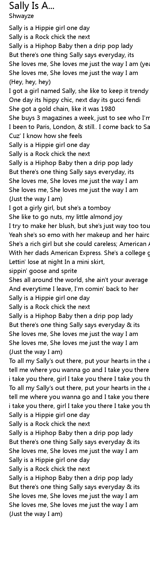 Mustang Sally Guess you better slow your Mustang down Mustang Sally my baby Guess you better slow that Mustang down You been runnin all over the town I guess you got to put your flat feet on the ground All you wanna do is ride around Sally Ride Sally ride All you wanna do is ride around Sally Ride Sally ride All you wanna do. Sally is a hippie girl one day Sally is a rock chick the next Sally is a hip-hop baby Then a trip hot lady But theres one thing Sally says everyday and its She loves.